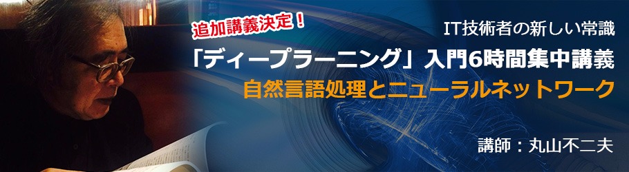 昨年9月から3回にわたって開催(うち2回は好評につき100名定員で追加開催)した丸山不二夫氏の「ディープラーニング入門」6時間集中講義のパート2を開催します。前回が画像系を中心にあつかった入門であったのに対して、今回のパート2では、要望の強かった「自然言語処理とニューラルネットワーク」と題して、グーグル翻訳やインテリジェントアシスタントで注目される自然言語処理がテーマとなります。